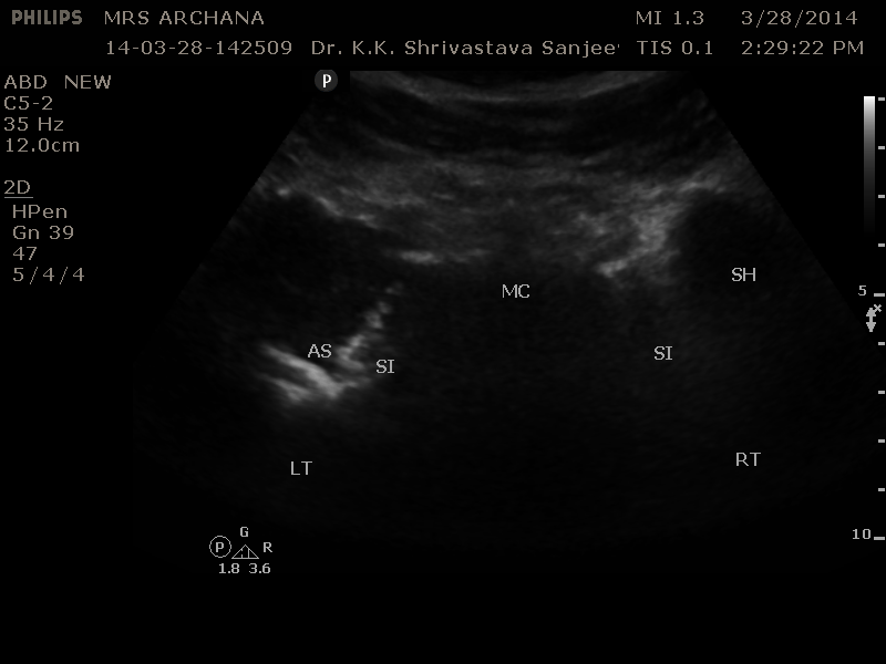 As is the standard protocol, S.I.Joints are evaluated with Linear multifrequency (12-5 Mhz) probe in prone position.